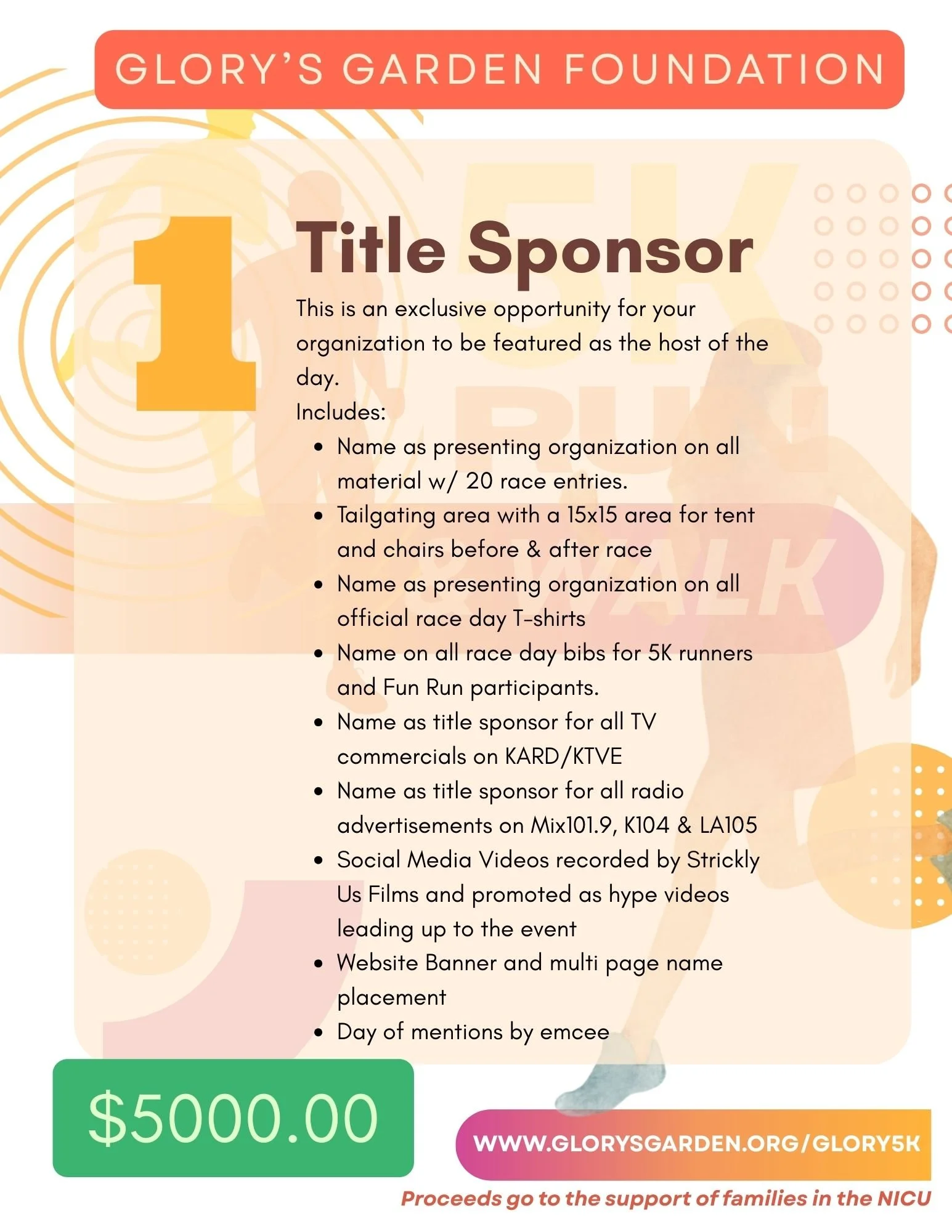 This is more than a race, it’s a gathering of hope. The Glory 5K directly supports NICU families with meals during long hospital stays, gas and travel assistance, lodging for out-of-town care, emergency bill relief, and encouragement for families navigating both crisis and recovery. As the only 5K in Northeast Louisiana dedicated specifically to these families, this event creates a powerful opportunity for your company to stand visibly with parents in their hardest moments while helping us build a lasting annual impact in our community.